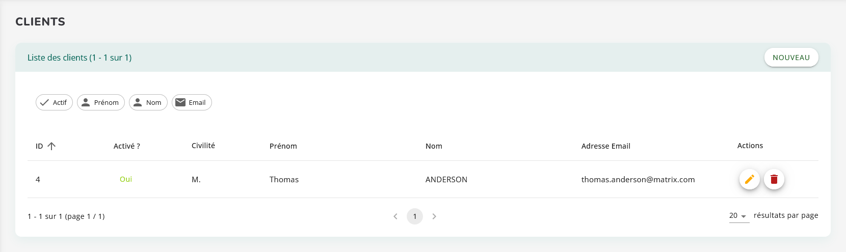 Des outils de recherche et de filtrage permettent de retrouver rapidement un client précis.