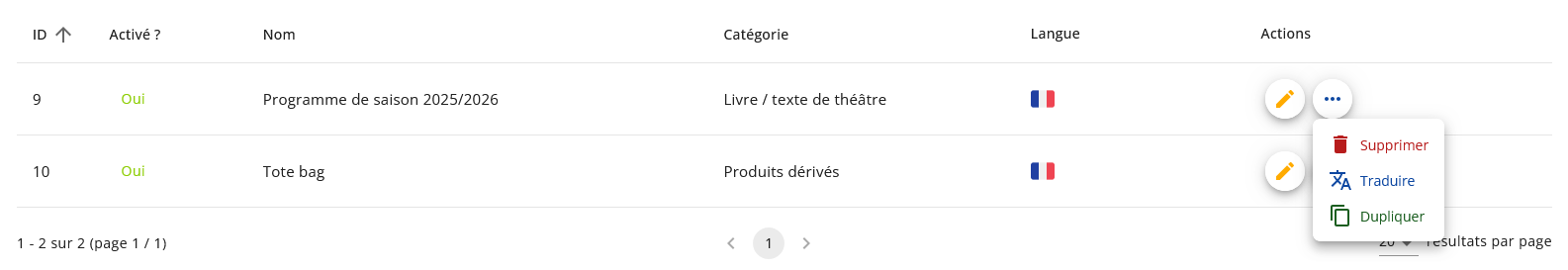 Actions disponibles sur un produit