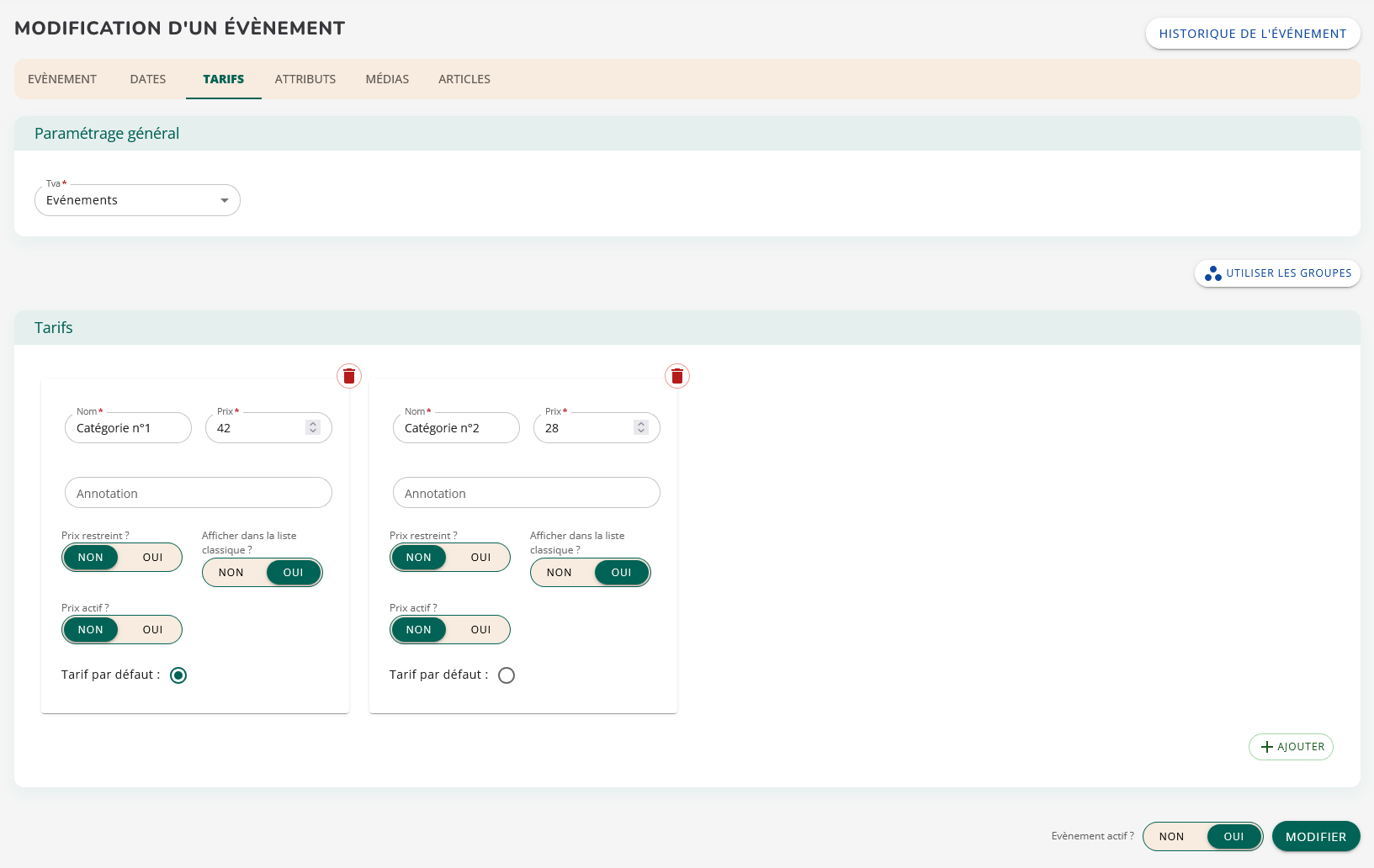 Depuis l’onglet Tarifs, il est possible d’ajouter autant de tarifs que nécessaire.