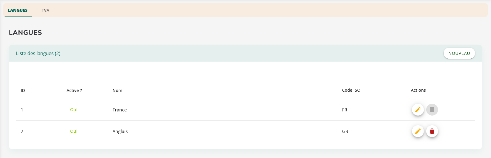 Activer une langue implique un travail de traduction. Une langue activée mais non traduite peut entraîner des incohérences d’affichage.