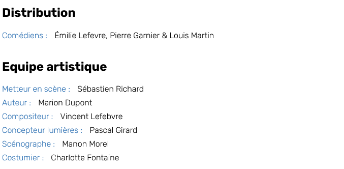- un texte long (ex. : Distribution, Note de mise en scène) ;