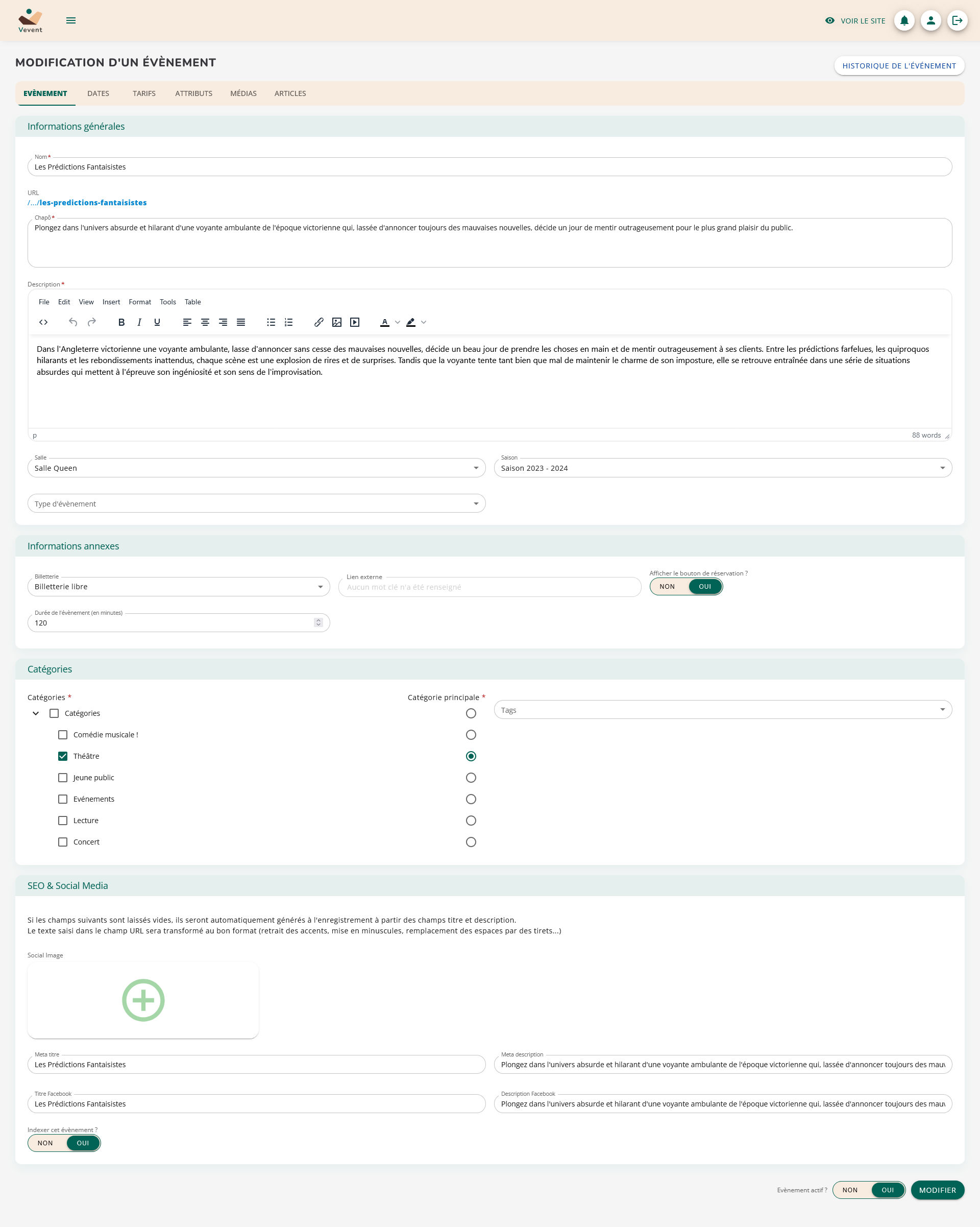 L’interface d’administration de Vevent s’organise autour de trois éléments principaux :
