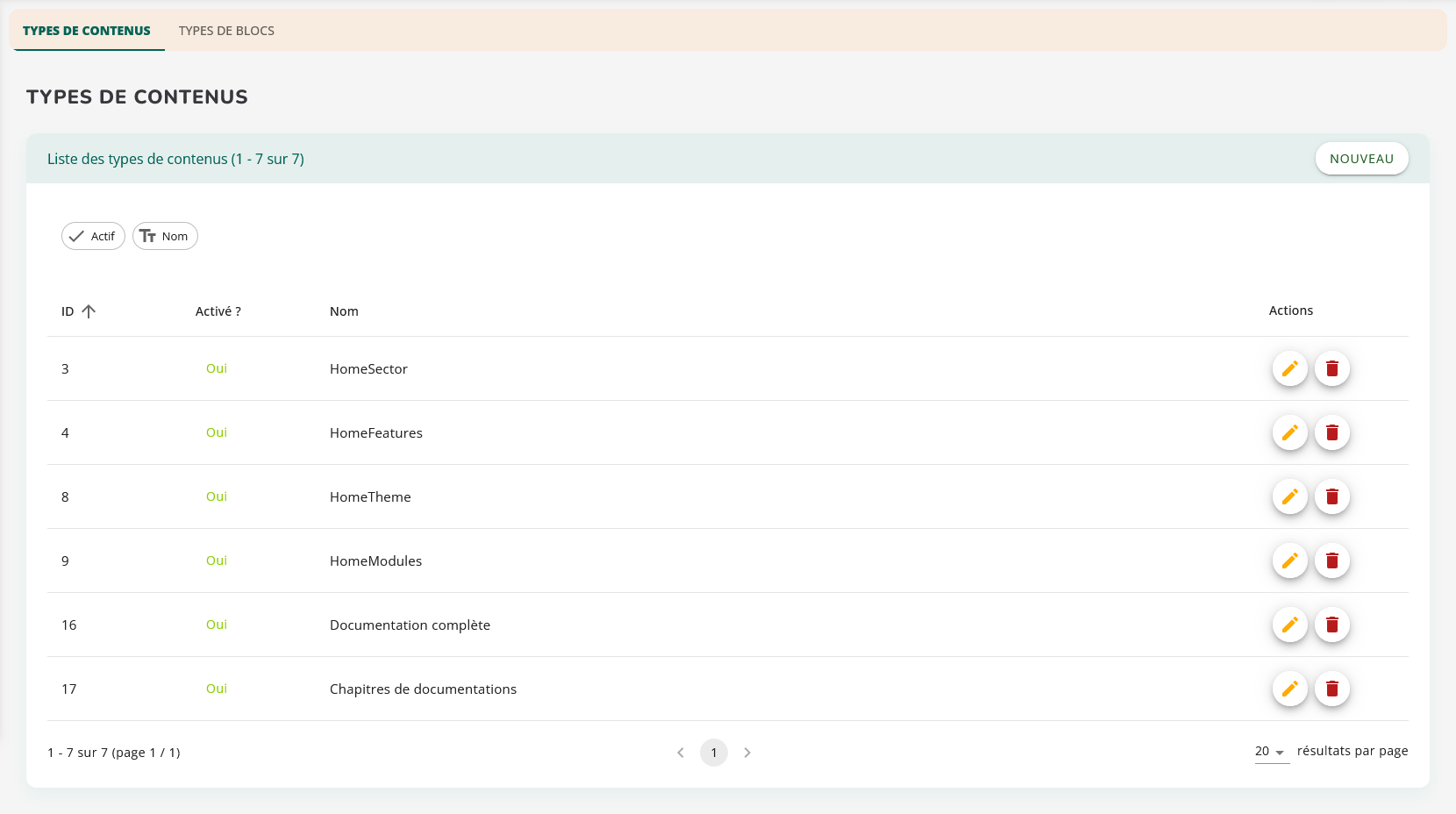 Chaque type de contenu dispose de son propre écran de gestion.